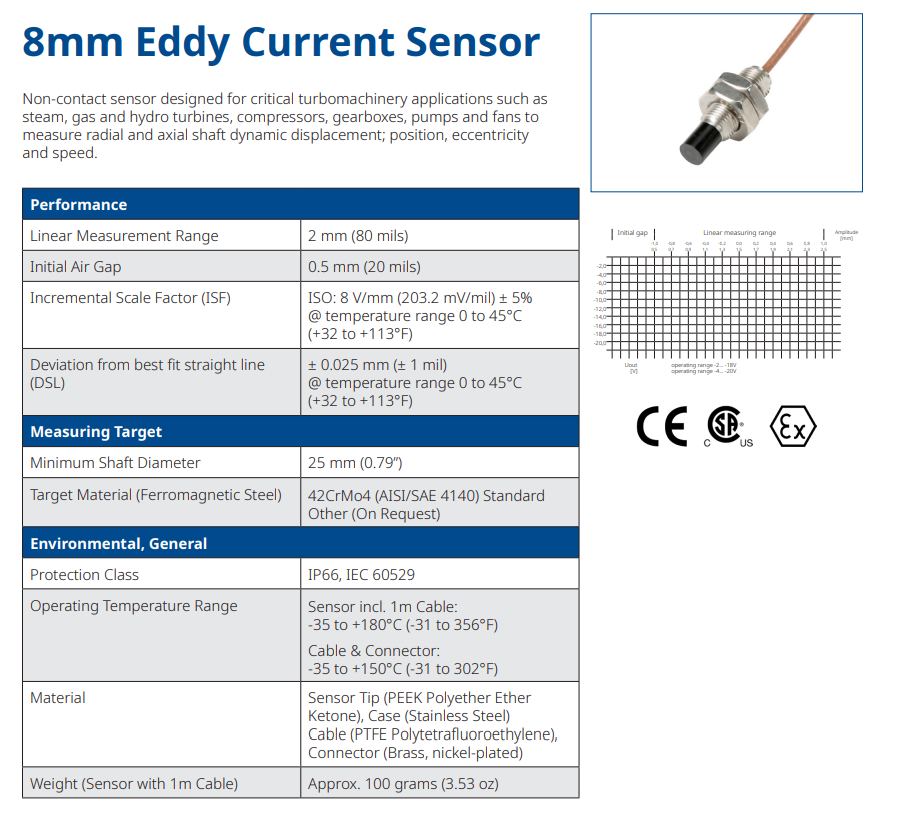 Emerson EPRO PR6423/002-030 is an 8mm Eddy Current Sensor, which is designed for critical turbomachinery applications such as steam, gas and hydro turbines, compressors, gearboxes, pumps and fans to measure radial and axial shaft dynamic displacement; position, eccentricity and speed.